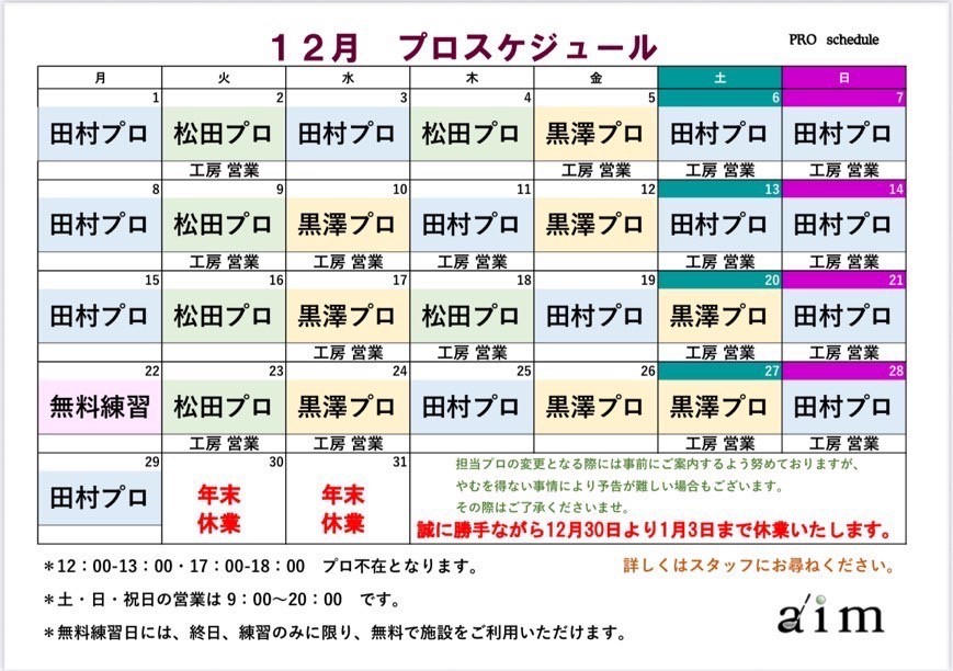 12月のプロ&工房スケジュールをお知らせいたします。