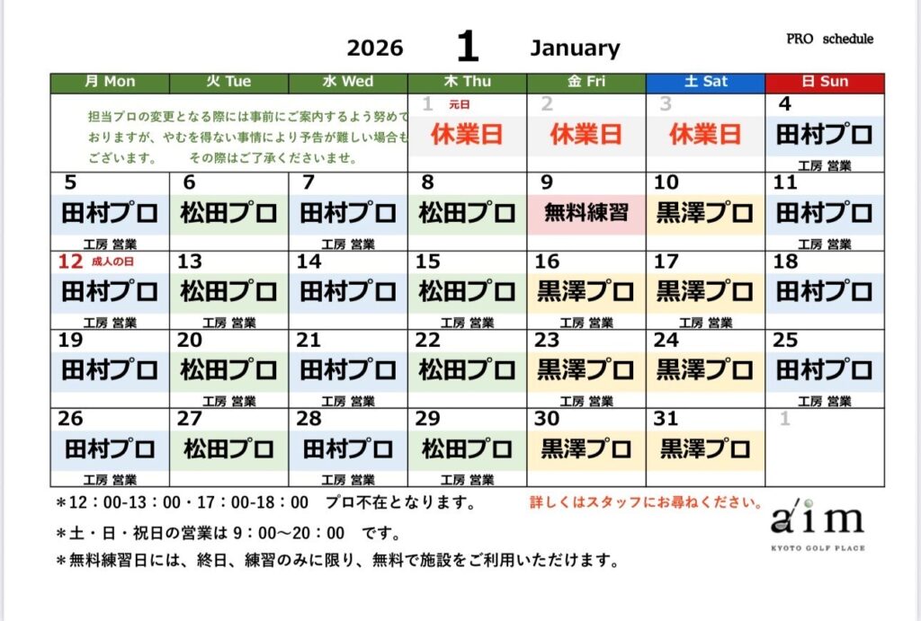 2026年1月のプロスケジュール&工房営業📅